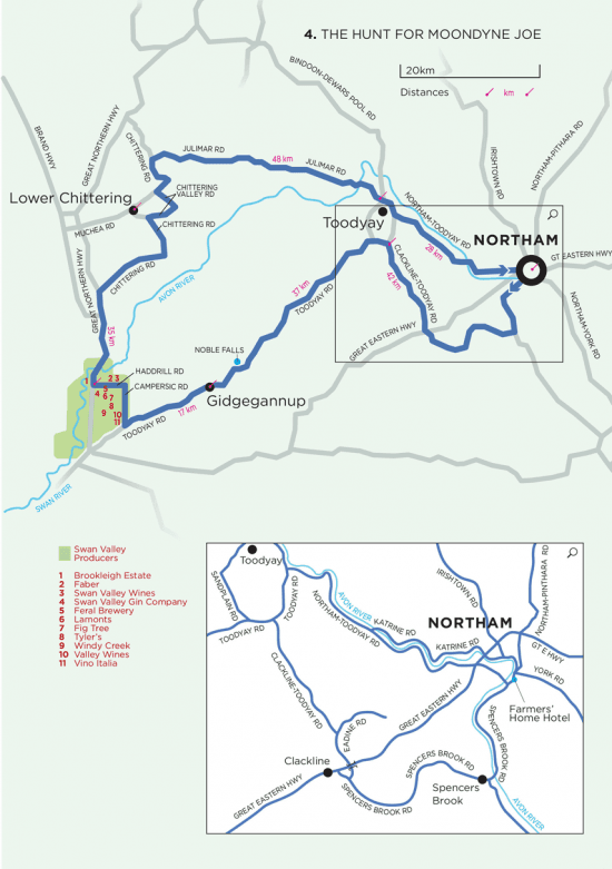 We follow the the coastal plain north on Great Northern Highway as we pass through Upper Swan and Ellenbrook. On your right hand side, to the east, you can see the Darling Ranges as we pass Walyunga National Park, which is where the Avon River cuts its way through the hills to join the Swan River. At Bullsbrook we turn towards the Chittering Valley on Chittering Road. We follow this road as it climbs and winds with the Brockman River, gradually bending north. At Lower Chittering we turn right into Chittering Valley Road and continue following the Brockman River. We re-join Chittering Road before turning right into Julimar Road and begin heading east towards Toodyay through the Julimar State Forrest. To our right, the whole way, is the country where Moondyne Joe first roamed after his release in Fremantle.