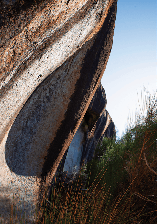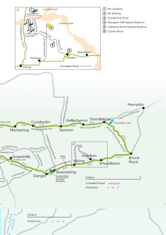 Just over eight kilometres past Pink Lake we take a turn north on the Kellerberin Yoting Road, towards the Granite Way. The trail ahead takes us off the bitumen road for just over 30 kilometres. So, if getting red streaks up the side of your car is a concern, you may wish to continue to Shackelton. Another bitumen-only option here is to drive the 15 kilometres to Mount Stirling, where you will still see these giant granite outcrops rising from the plains, and return the way you came before continuing to Shackelton and Bruce Rock. The gravel section of the Granite Way is well maintained though, and easily navigated by a standard two-wheel-drive car. The Shires of Bruce Rock, Quairading and Kellerberrin all cooperate to keep the road graded, but, as always when travelling the bush, if you have any concerns, then contact one of these shires for an update on the road conditions.